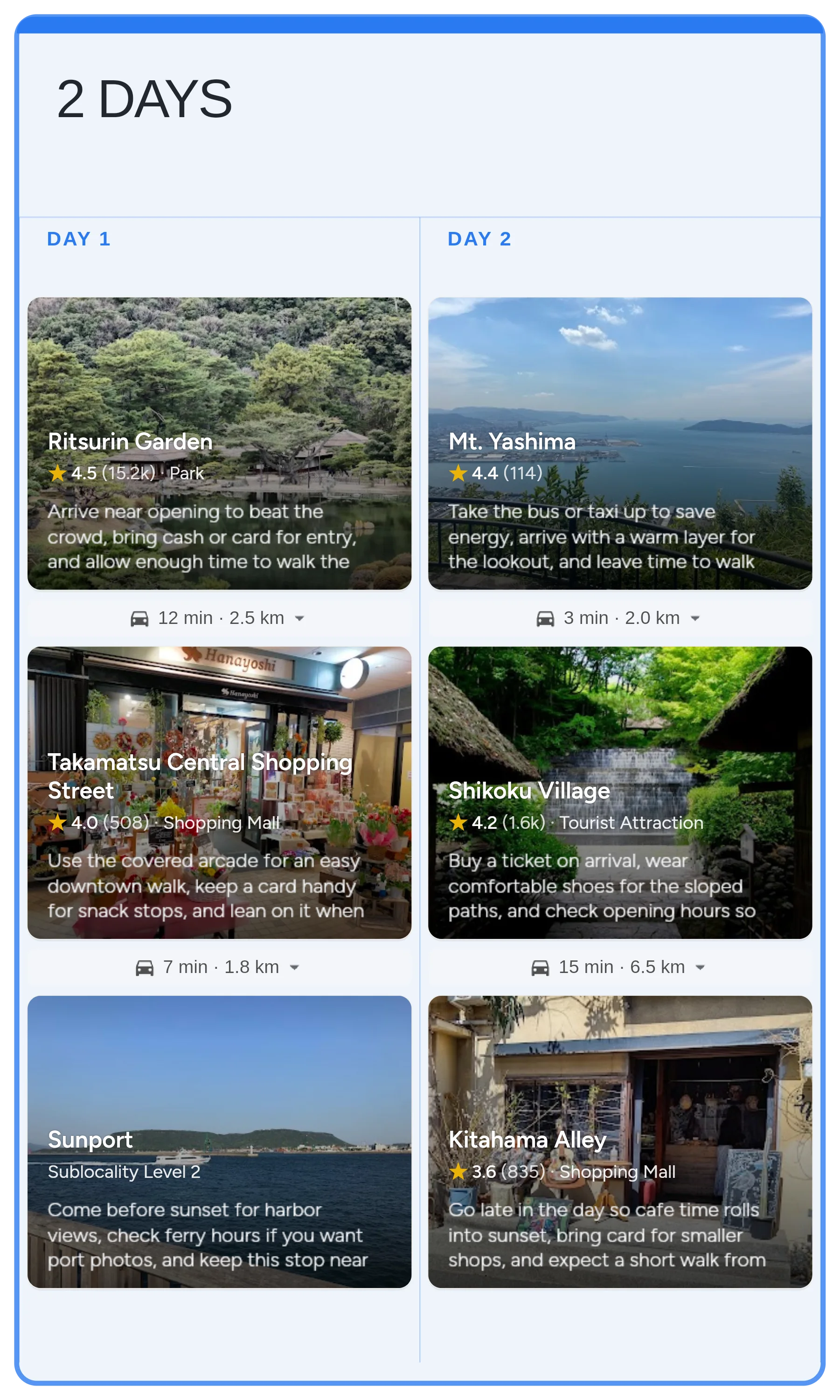 Start with the real Takamatsu board in Instaboard - mapped stops, day-by-day structure, and live sharing - then tailor the pacing, bookings, and notes to your trip.
