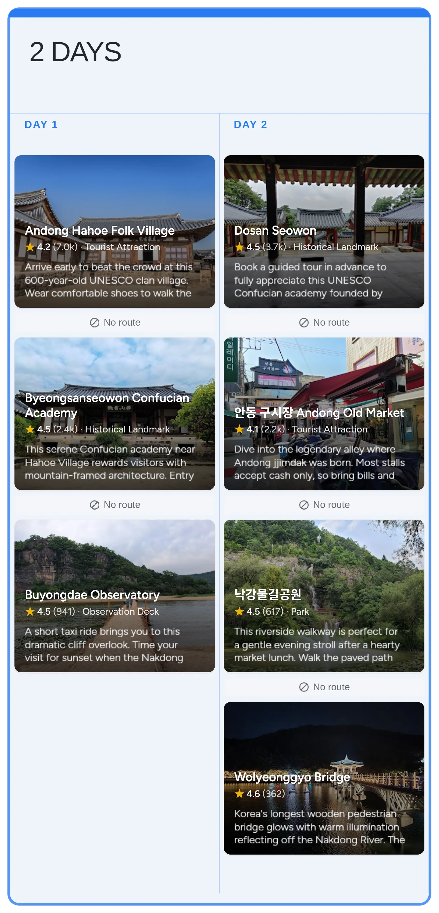 Build a 2-day Andong city break around Confucian heritage academies, a 600-year-old folk village, and riverside evening walks. Day 1 starts early at Hahoe Folk Village, moves to Byeongsan Seowon Confucian Academy, and ends with sunset views from Buyongdae Cliff above the Nakdong River. Day 2 covers Dosan Seowon, jjimdak lunch at the old market, and the illuminated Wolyeonggyo Bridge after dark. Spring and autumn bring mild weather, but the heritage sites, village paths, and night views reward visitors year-round.
