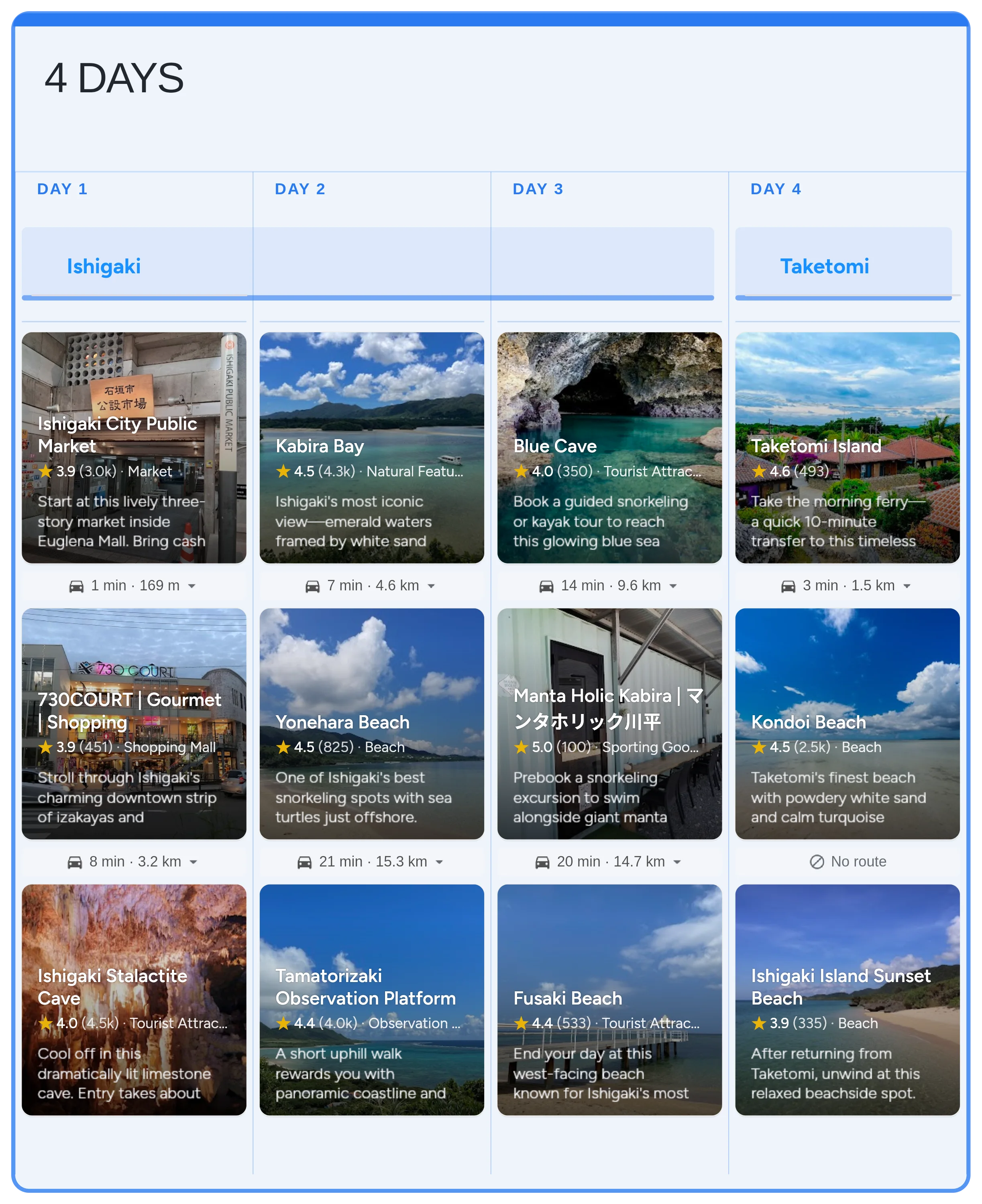 Build a flexible 4-day Ishigaki city-break plan with an interactive itinerary focused on emerald bays, reef snorkeling, and local food stops, plus an easy Taketomi Island day trip.