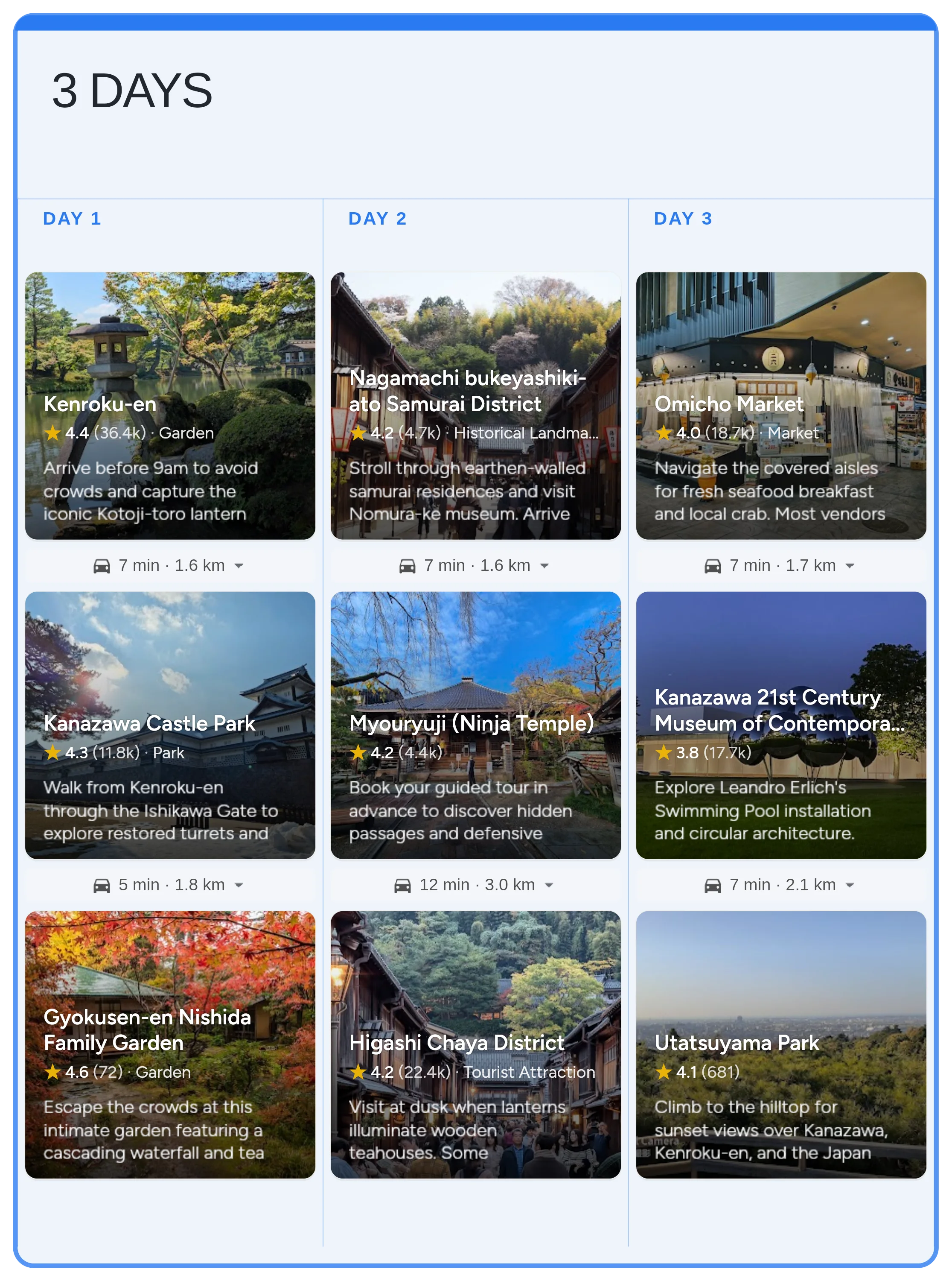 Build a 3-day Kanazawa trip around Kenrokuen Garden's autumn maples, the wooden teahouses of Higashi Chaya District, and morning seafood at Omicho Market. This itinerary pairs castle grounds and ginkgo-lined paths with samurai-district lanes and a contemporary art stop, with late October through November bringing the best foliage color and comfortable walking temperatures.