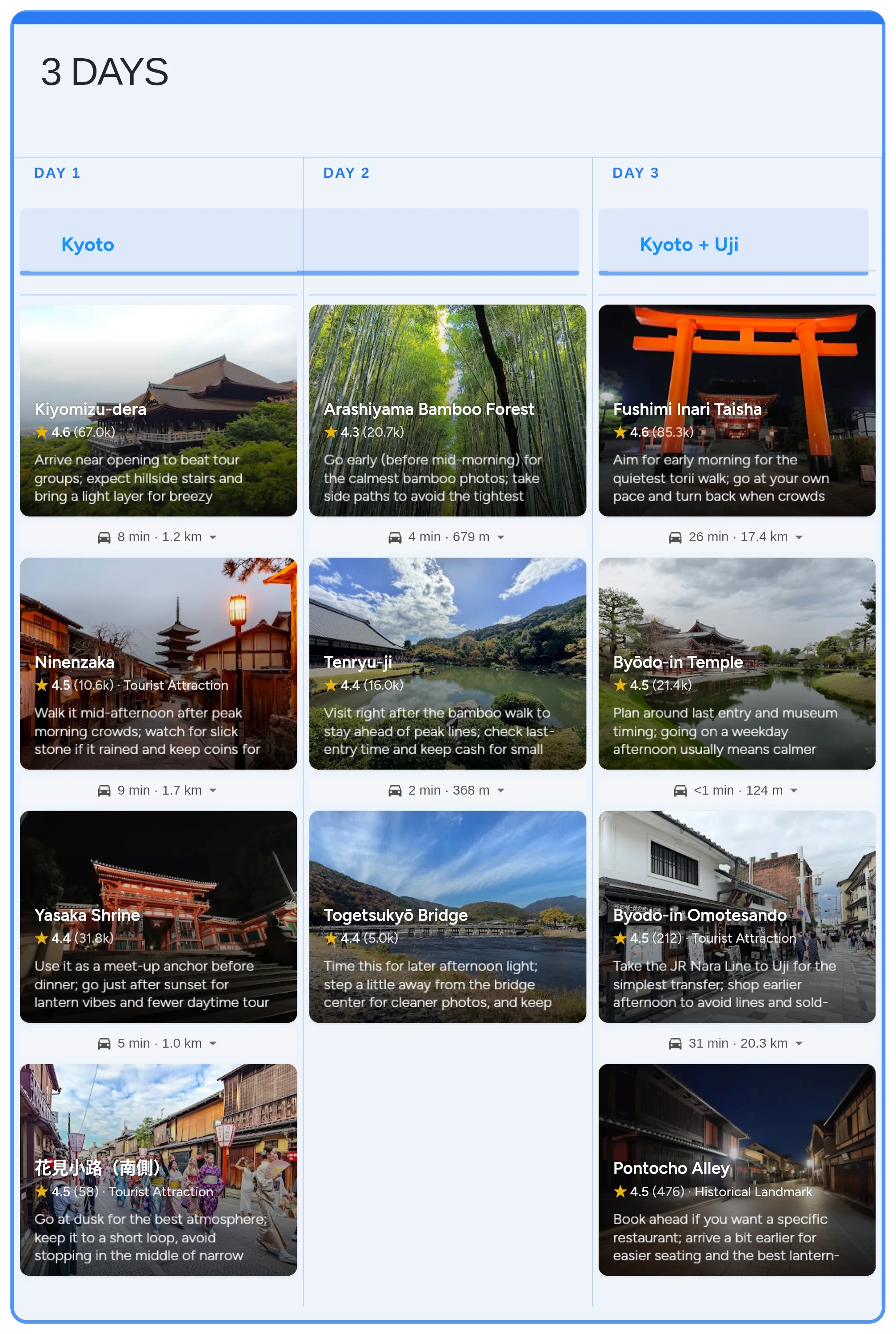 Build a 3-day Kyoto trip around Higashiyama temple walks, an Arashiyama morning loop, and a Fushimi Inari sunrise hike with Pontocho dinners. This itinerary keeps transit tight and reserves evenings for old-street strolls and riverside food.