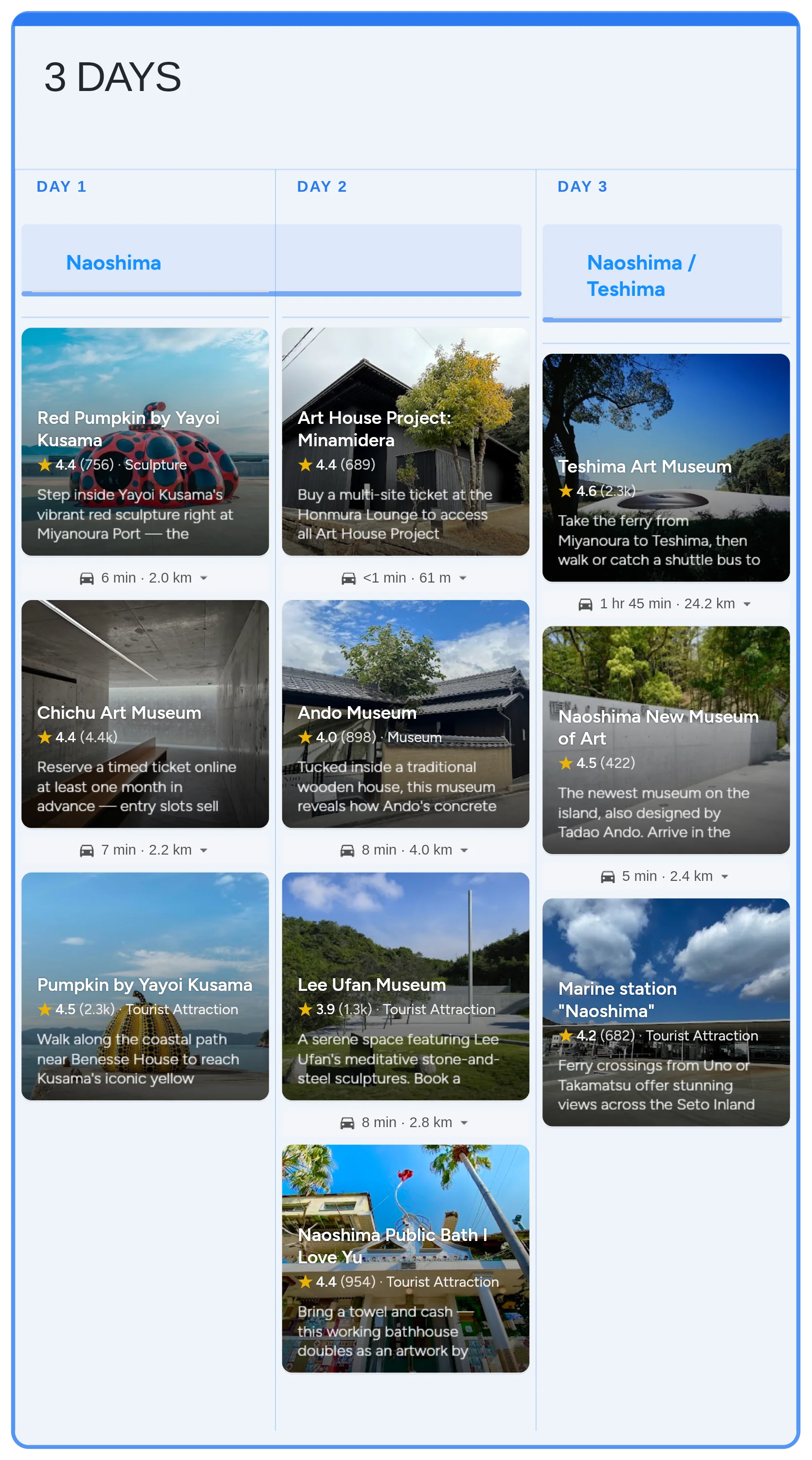 Build a 3-day Naoshima trip around the Chichu Art Museum underground galleries, a morning walk through the Honmura art houses, and a day trip to Teshima. This itinerary clusters Day 1 around the Miyanoura waterfront and Chichu Art Museum, Day 2 around the Honmura art houses, Lee Ufan Museum, and the Naoshima Bath, and Day 3 around a morning ferry to Teshima and a final afternoon at the Naoshima New Museum of Art. Spring and autumn bring clear skies and golden light over the coastal installations, while winter shortens museum hours but leaves the island nearly empty.
