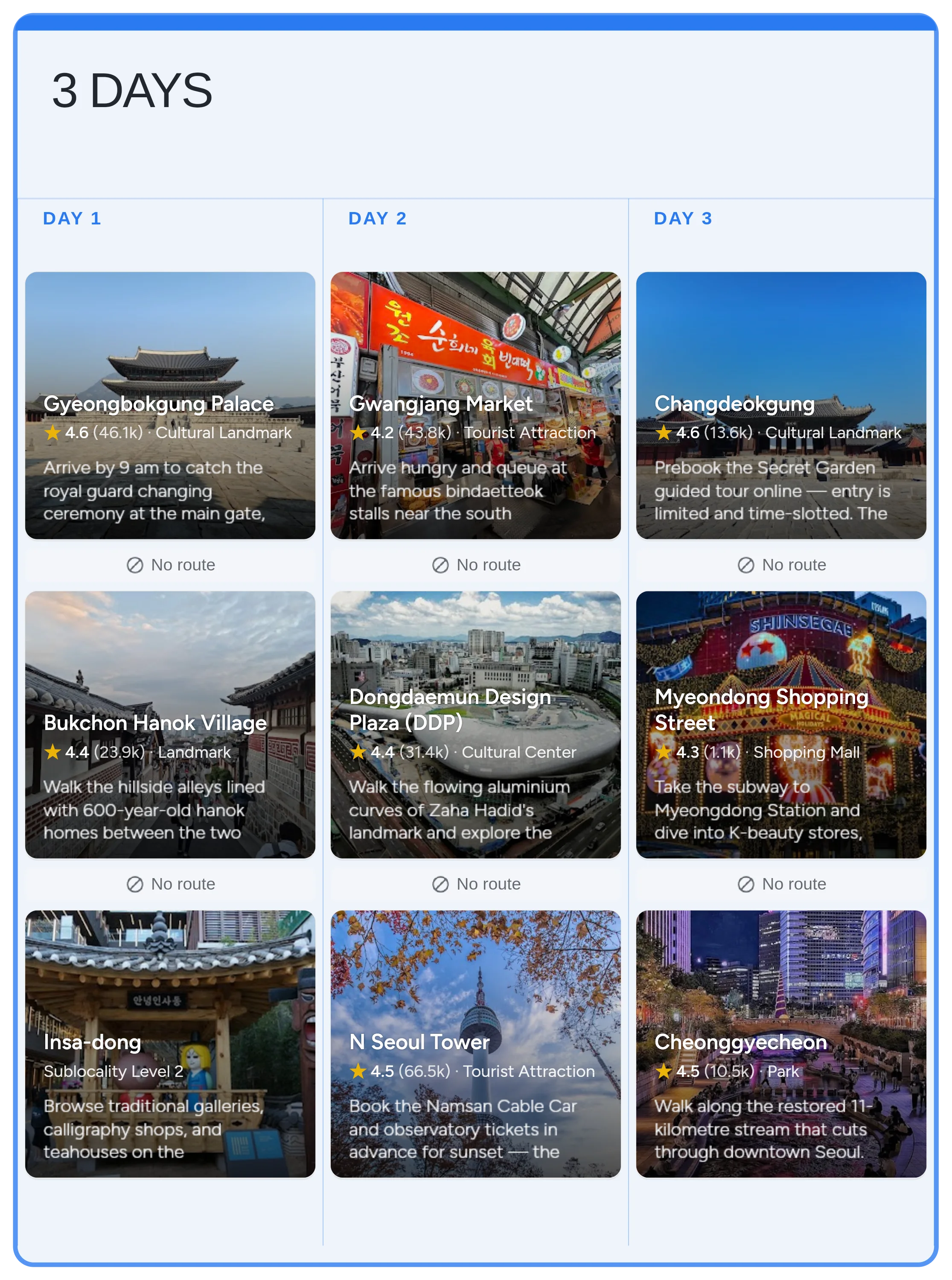 Build a 3-day Seoul city break around royal palaces, traditional hillside neighborhoods, and sunset skyline views. Day 1 walks through Gyeongbokgung Palace, Bukchon Hanok Village, and Insa-dong in Jongno. Day 2 starts at Gwangjang Market, passes the Dongdaemun Design Plaza, and ends with a cable car up N Seoul Tower at sunset. Day 3 covers Changdeokgung Palace, Myeongdong shopping, and an evening stroll along the Cheonggyecheon Stream. Spring and autumn bring mild weather, but the palaces, markets, and cafe scene reward visitors year-round.