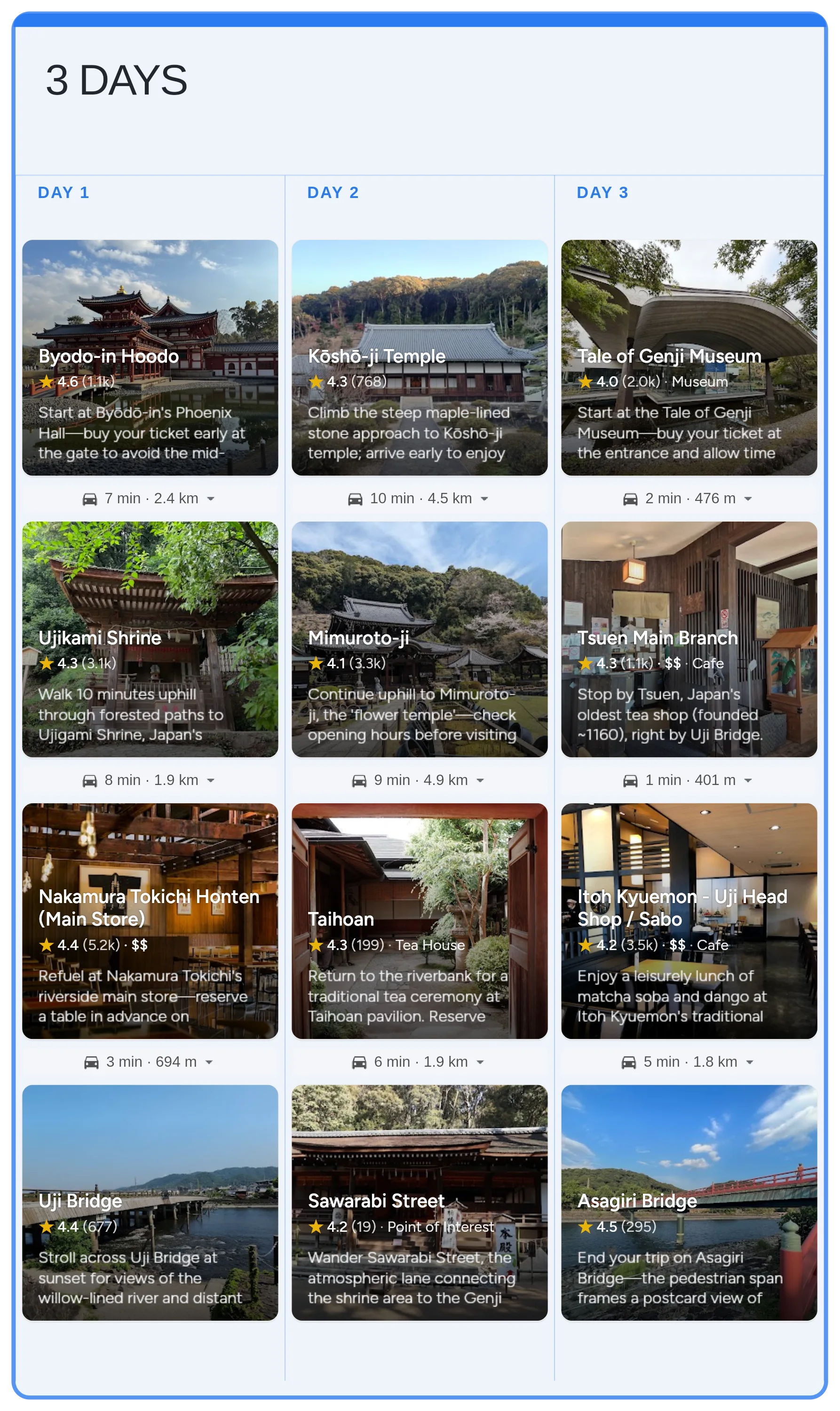 Build a 3-day Uji trip around Byodoin's Phoenix Hall, a morning walk up Koshoji's maple-lined stone approach, and an afternoon tea ceremony on the Uji riverbank. This itinerary clusters Day 1 around Byodoin, Ujigami Shrine, and Nakamura Tokichi's riverside tea house, Day 2 around Koshoji's stone steps, Mimurotoji's hilltop flower gardens, and a tea ceremony at Taihoan, and Day 3 around the Tale of Genji Museum, Tsuen Tea by the old bridge, and a sunset view from Asagiri Bridge. Spring brings cherry blossoms along the Uji River and the first matcha harvest, while autumn frames the Phoenix Hall in red and gold maple foliage.